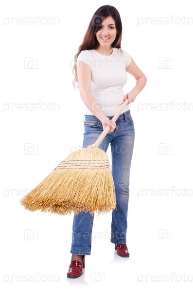 Молодая женщина с веником, изолированная на белом
