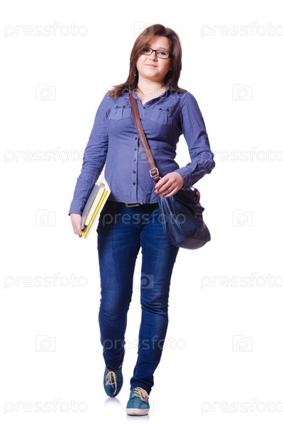 Студентка с книгами на белом фоне