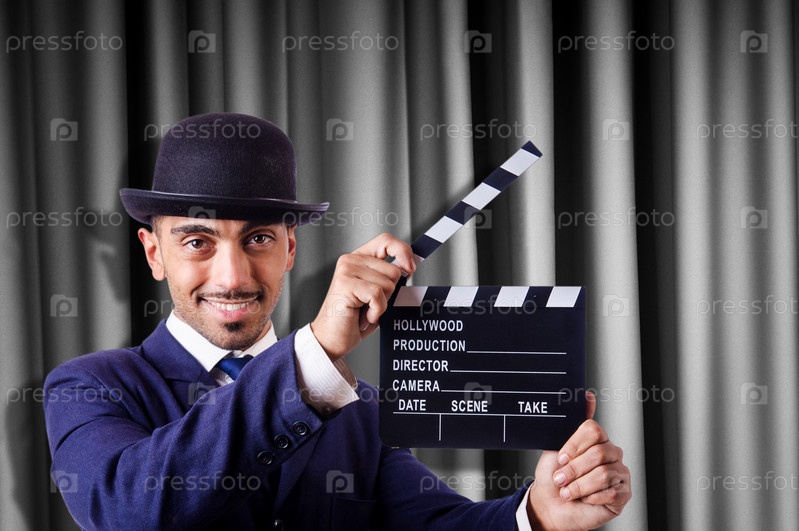 Мужчина с кинохлопушкой на фоне занавеса