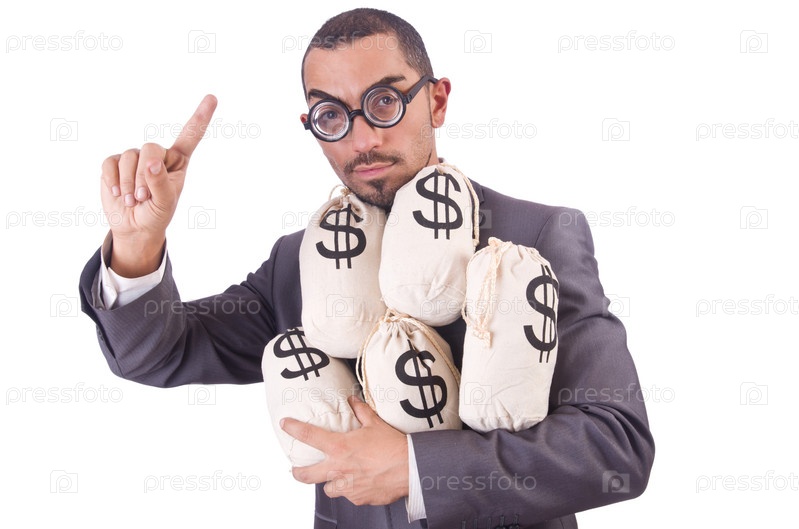Мужчина с мешками денег на белом фоне