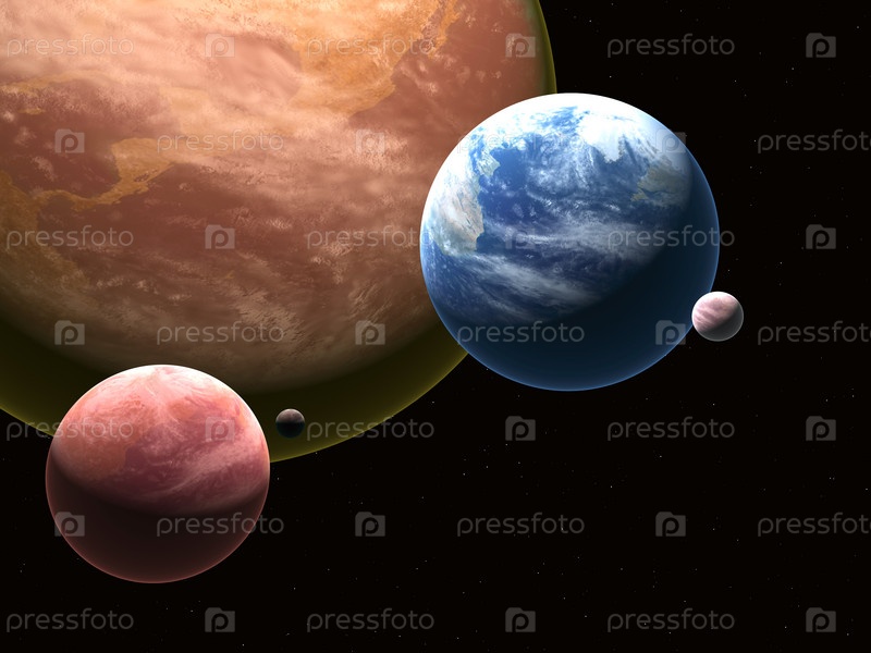 Пять планет в космосе. На переднем плане Земля и Марс