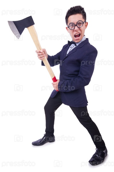 Забавный мужчина с топором на белом