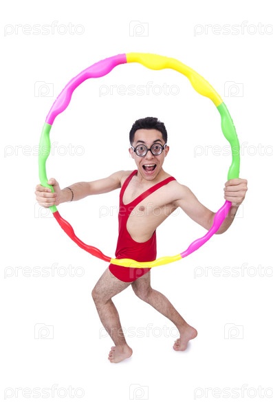Смешной спортсмен с хула-хупом на белом