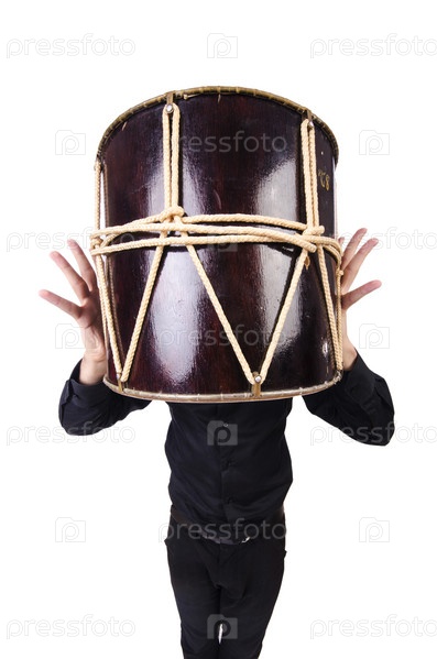 Забавный человек с барабаном на белом