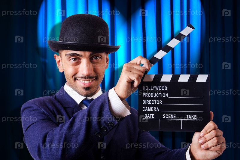 Мужчина с кинохлопушкой на фоне занавеса