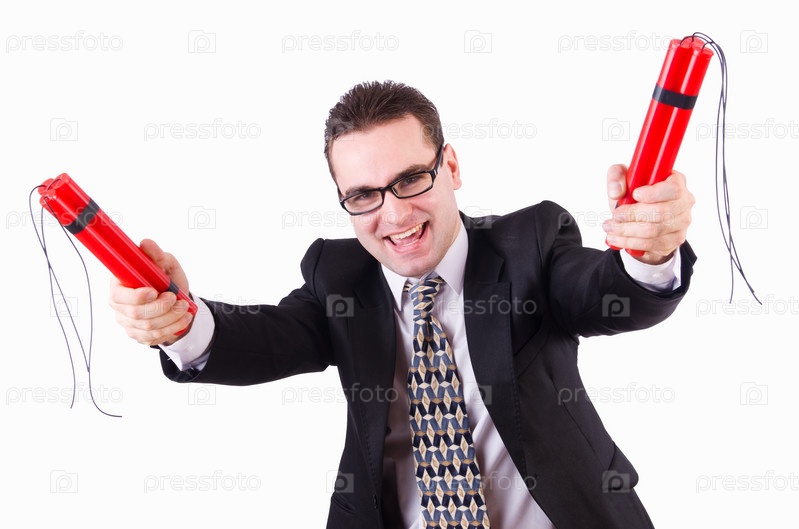 Бизнесмен с динамитом, изолированный на белом фоне