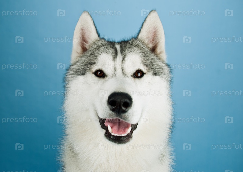 Собака хаски в студии на синем фоне