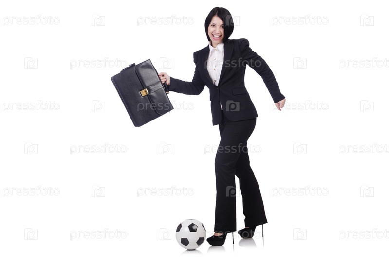 Бизнес-леди с мячом на белом фоне