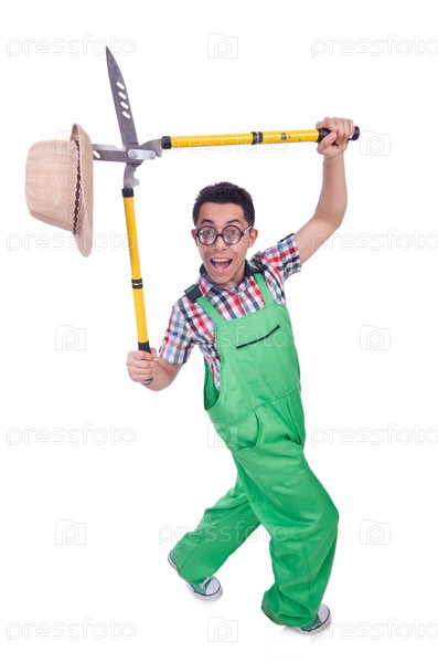 Забавный мужчина с секатором на белом фоне