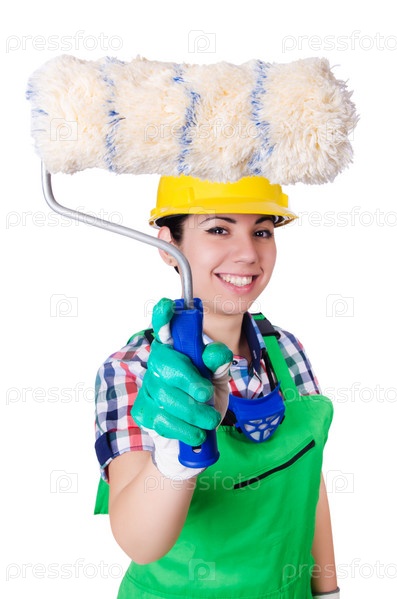 Женщина-маляр с кистью на белом фоне