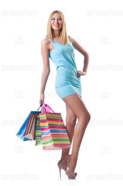 Высокая девушка с хорошими покупками на белом фоне