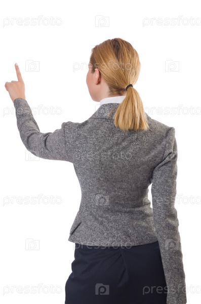 Деловая женщина нажимает виртуальную кнопку на белом фоне