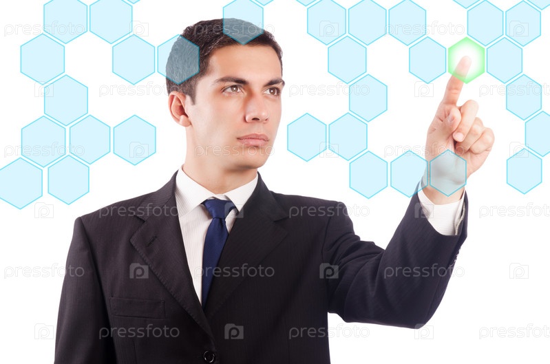 Молодой бизнесмен нажимает на виртуальные кнопки