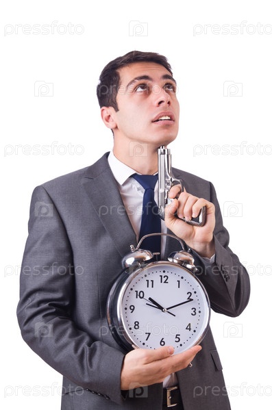 Мужчина с пистолетом и будильником на белом фоне