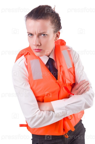 Молодая женщина в спасательном жилете на белом