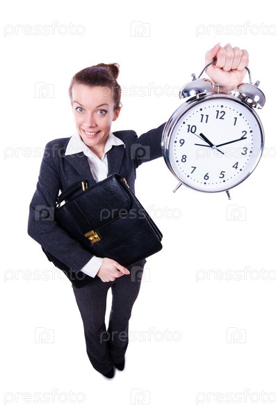 Смешная женщина с часами на белом фоне