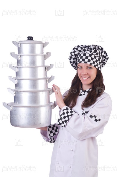 Повар с кастрюлями на белом