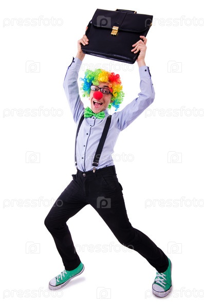 Клоун-бизнесмен, изолированный на белом