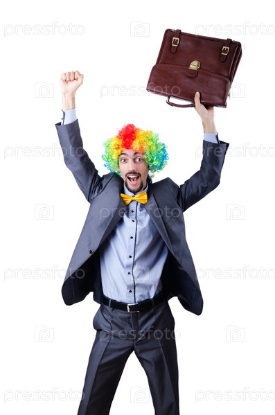 Клоун бизнесмен, изолированны на беломй