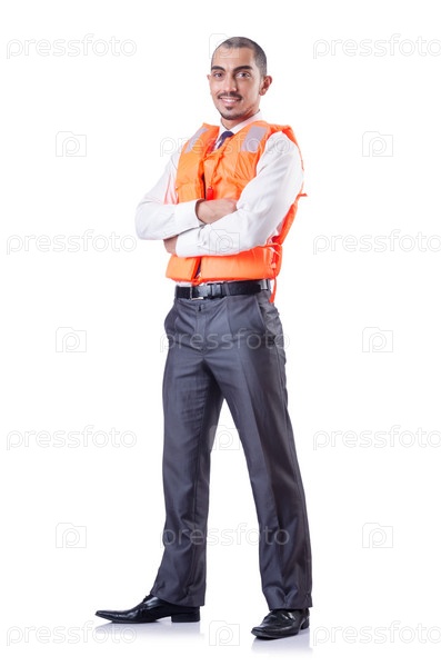 Человек в спасательном жилете, изолированный на белом фоне