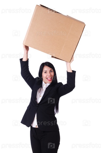 Женщина с большим количеством коробок на белом фоне