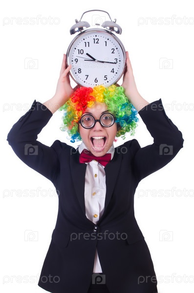 Забавный клоун с часами на белом