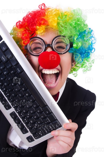 Забавный клоун с клавиатурой на белом