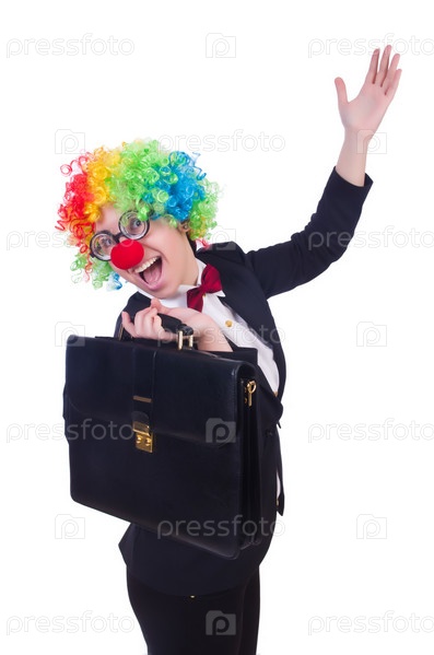 Бизнес-леди клоун, изолированная на белом