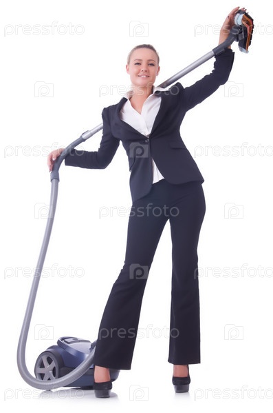 Бизнес-леди с пылесосом на белом фоне