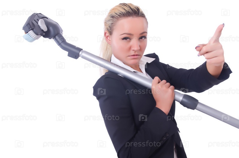 Бизнес-леди с пылесосом на белом фоне
