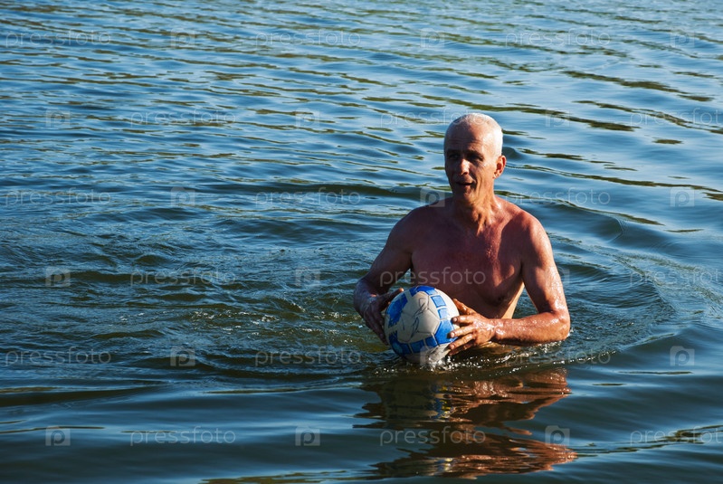 Мужчина плавает с мячом в речке Ингулец, Украина