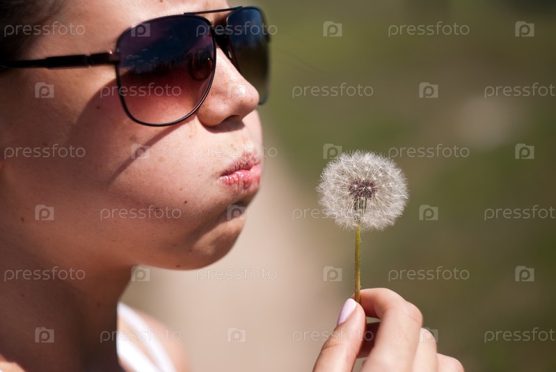 Девушка дует на одуванчик на улице