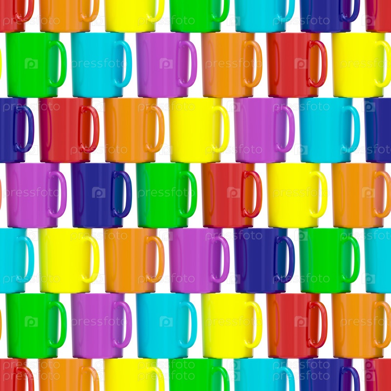 Бесшовный фон состоит из красочных керамических чашек, изолированных на белом. 3D-изоляция с высоким разрешением