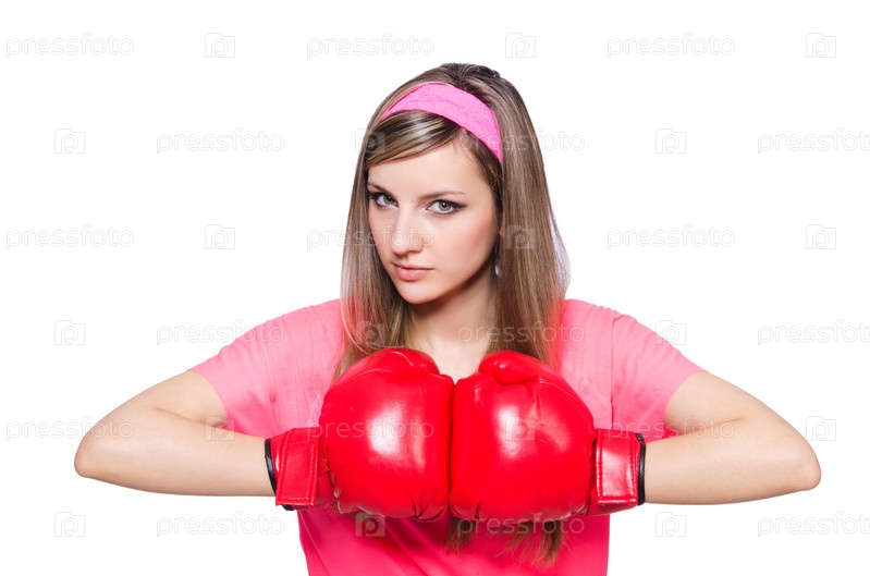 Девушка с боксерскими перчатками на белом