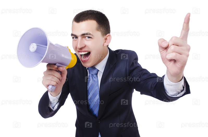 Человек с громкоговорителем, изолированный на белом