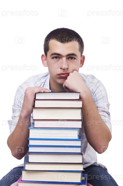 Студент с большим количеством книг на белом фоне