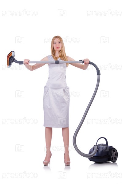 Молодая женщина с пылесосом на белом фоне