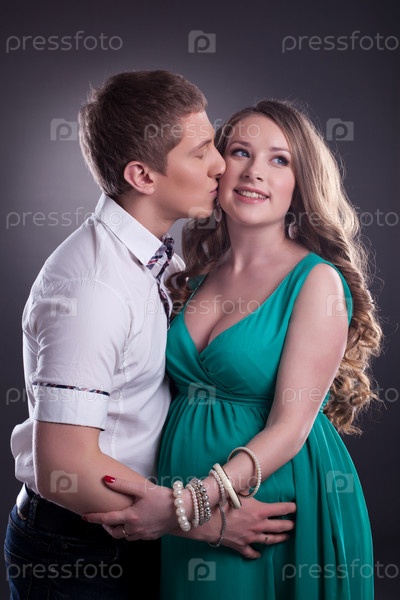 Мужчина целует веселую беременную женщину