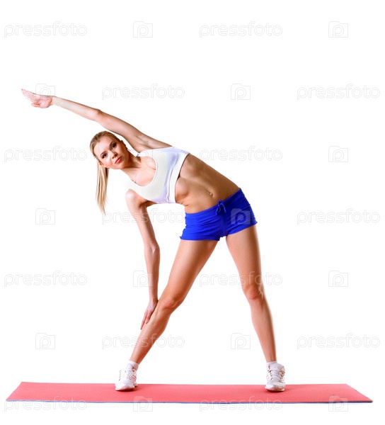 Гибкая блондинка занимается аэробикой в студии