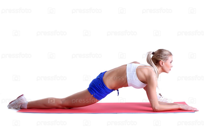 Красивая блондинка позирует на гимнастическом коврике