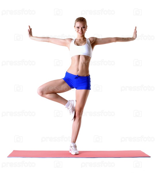 Привлекательная блондинка позирует на коврике в студии