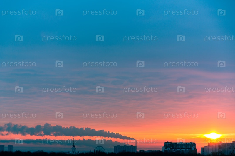 Труба с дымом на фоне зимнего заката