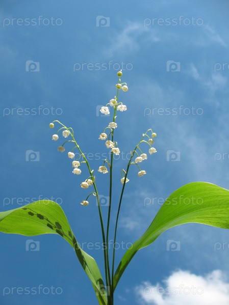 Цветящий ландш майский, сonvallaria majalis, на фоне голубого неба