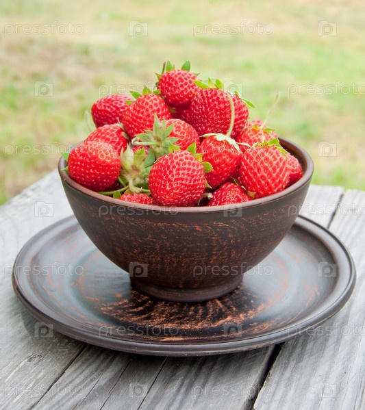 Клубника в миске в летнем саду