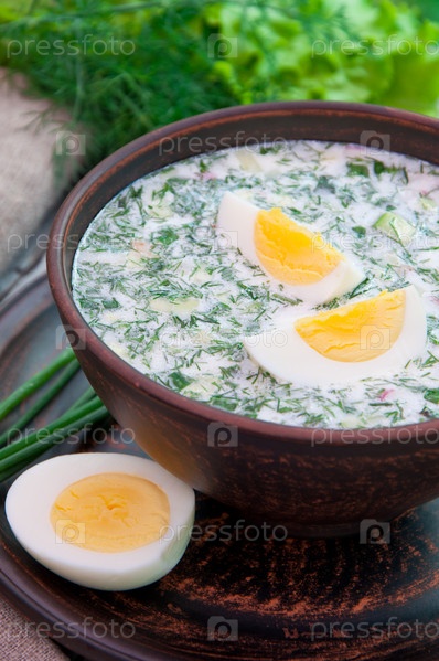 Холодный овощной суп с кефиром, яйцом и зеленью