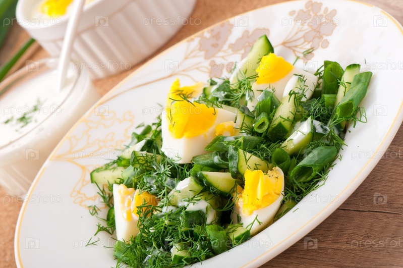 Салат из вареных яиц, зеленого лука и огурцов с заправкой из йогурта