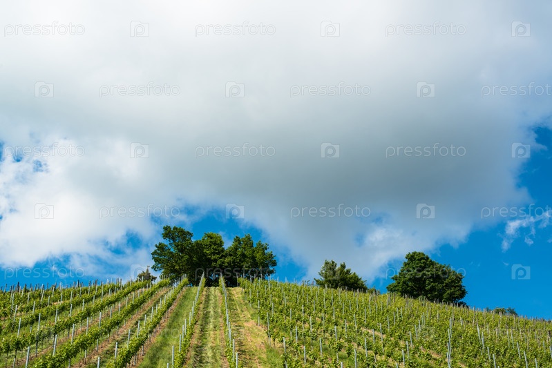 Весенний виноградник с большим голубым небом