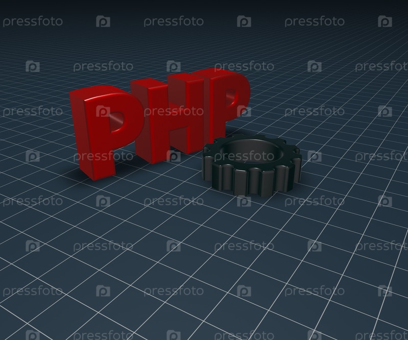 Тег PHP и деталь на синей поверхности - 3d иллюстрация