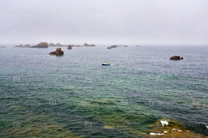 Лодка возле каменного побережья Бретани в дождь