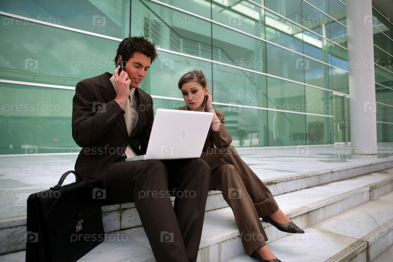 Деловая пара сидит на лестнице
